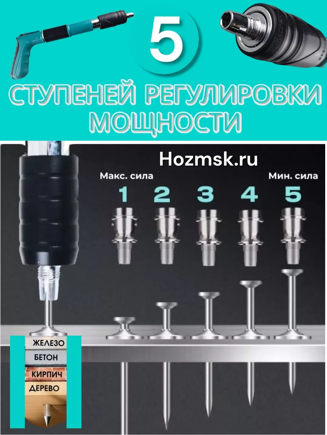 Мощный гвоздезабивной мини-пневмопистолет для дюбель гвоздей изготовлен из высококачественного пластика и металла, и имеет 5 ступеней регулировки мощности.